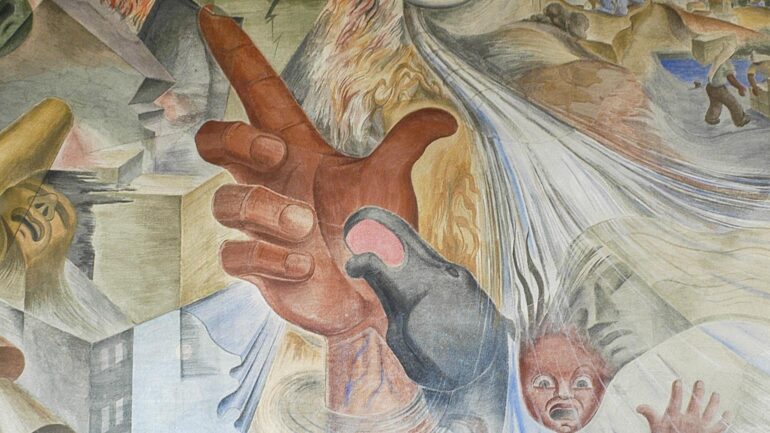Nos referimos a “Historia de Concepción” del artista Gregorio de la Fuente. En esta hermosa pintura podemos ver una escena en el centro del cuadro donde se observan las consecuencias de unos vientos huracanados.