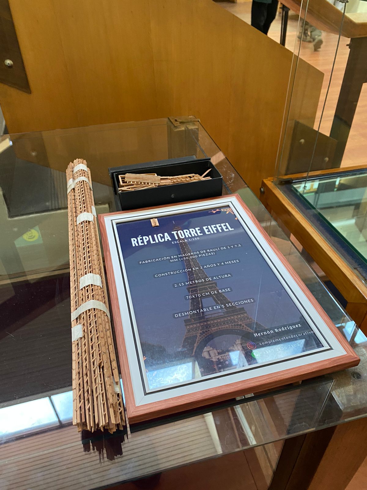 Tras 2 años y 4 meses, concluyó la obra de escala 1:150. Ni una sola gota de pegamento o adhesivos. Más de 50 mil piezas encajan perfectamente en esta obra de 2 metros 15 centímetros de altura y 70×70 centímetros de base, hecha con madera de raulí.