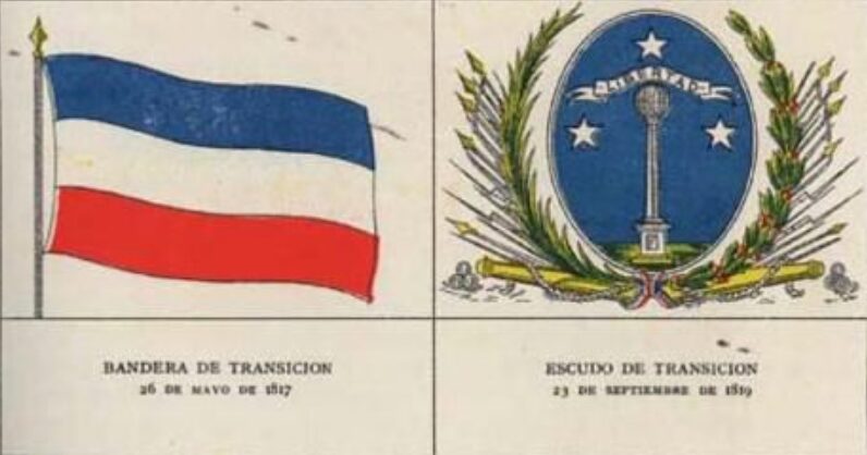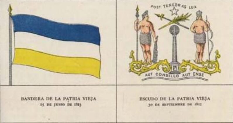Durante el período de la Patria Vieja, el pabellón patrio tenía tres franjas horizontales de colores azul, blanco y amarillo. Bordada en 1812, en ocasiones se le sumaba el escudo, con un hombre y una mujer mapuche con una lanza, una columna en el centro y las frases en latín “Post Tenebras Lux” (Después de las Tinieblas, la Luz) y “Aut Consilio Aut Ense” (Por la Razón o la Espada), consigna la web del Servicio Nacional del Patrimonio Cultural.