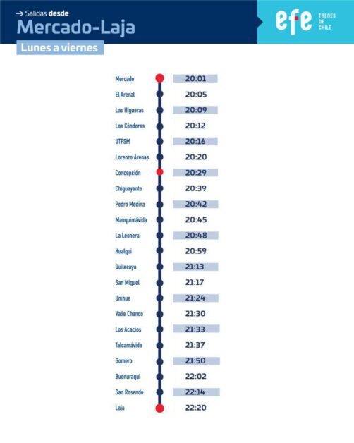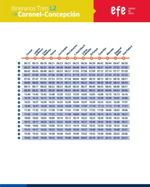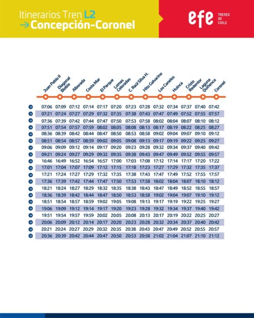 En la Línea 2, de Coronel a Concepción y viceversa, se dispondrán servicios especiales de trenes en los horarios punta de la mañana y la tarde.