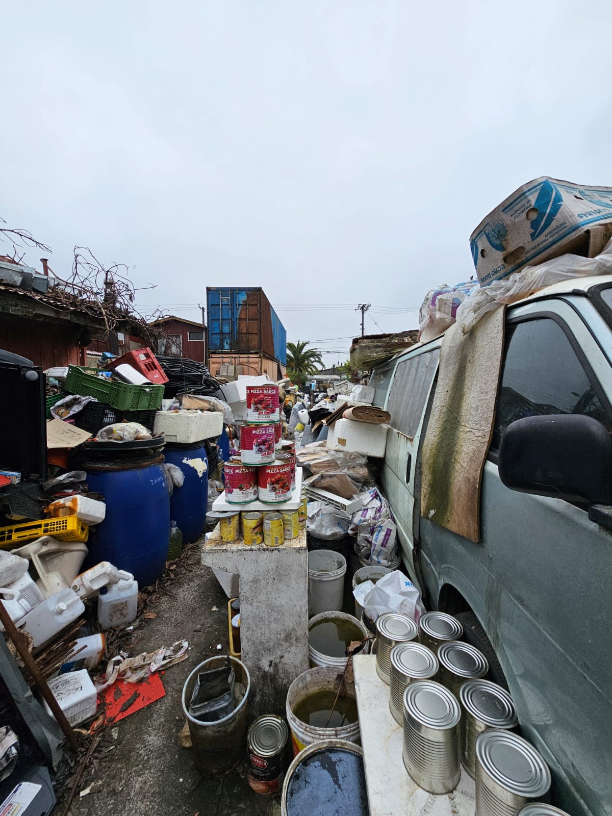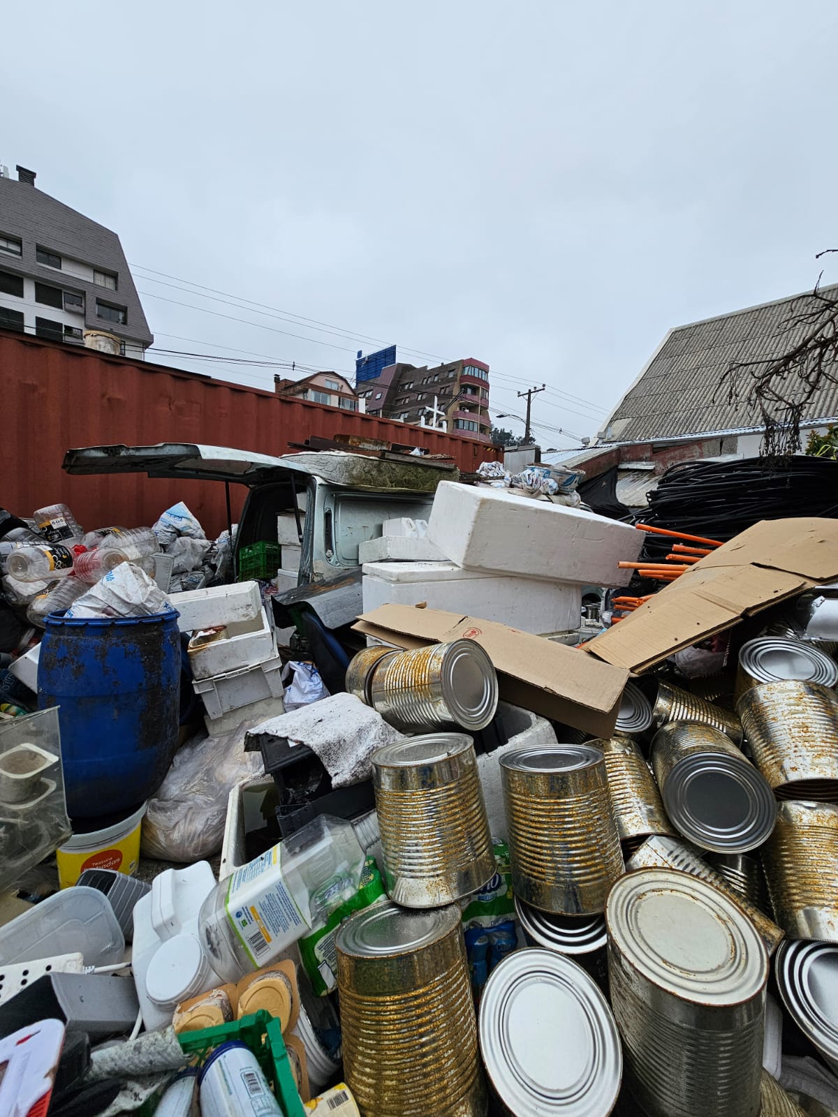 Un estrecho sitio en la calle Sargento Aldea, en el sector de Pedro de Valdivia Bajo. Es, seguramente, el centro de acopio del caso de mal de Diógenes más grande de la región. Desde fierros y plásticos hasta vehículos y containers con alimentos en descomposición. Todo cabe aquí.